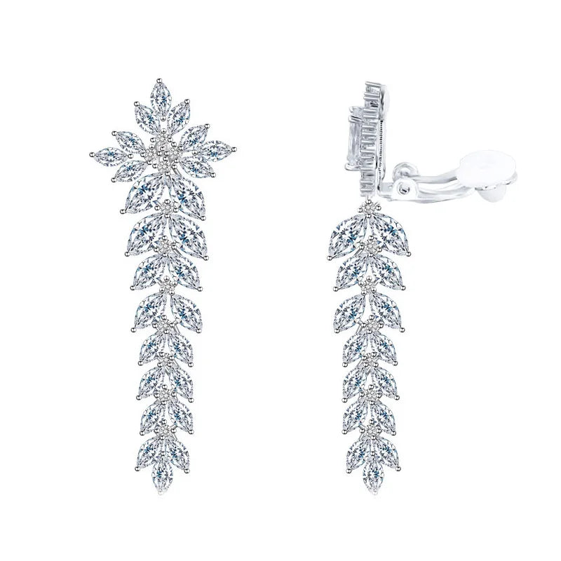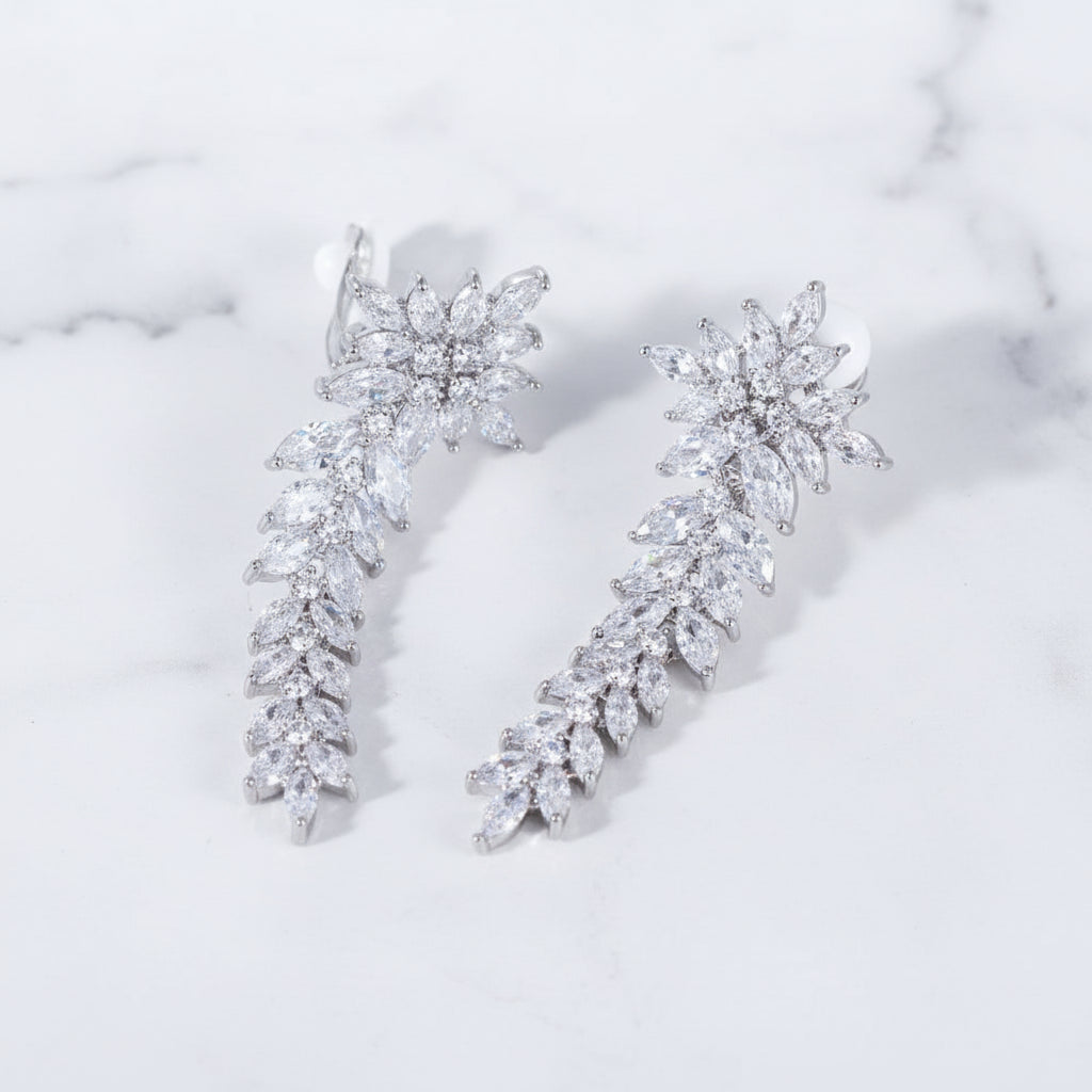 繊細なマーキスカットストーンをリーフ状に連ねたデザインが、耳元から流れるように輝き、上品で華やかな印象を演出します。