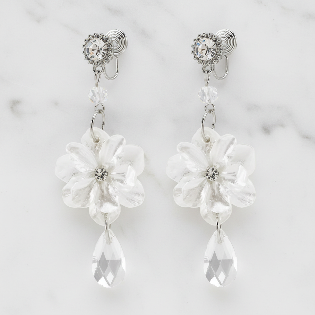 ラウンドシルエットのビジュー、可憐なフラワーモチーフ、うつくしいドロップビジューが華やかに新婦様のお顔まわりを演出してくれるピアス/イヤリングです。