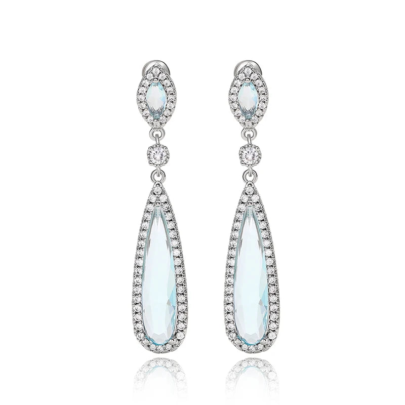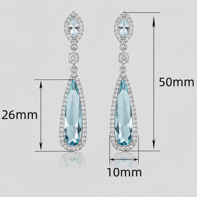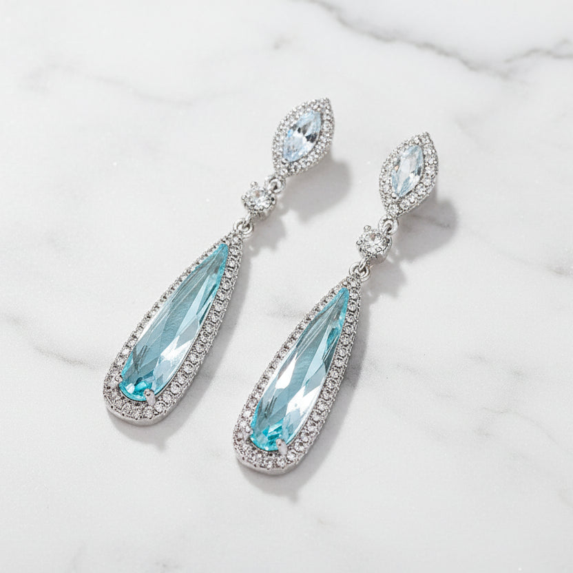 淡いブルーカラーのクリスタルが煌めくドロップピアス。透明感のあるブルークリスタルは、何層にも重なり合ったクリアストーンと共に新婦様の耳元を華やかに演出します。クラシカルなドレスや、何か青いもの(サムシングブルー)を取り入れたい花嫁様に最適です。